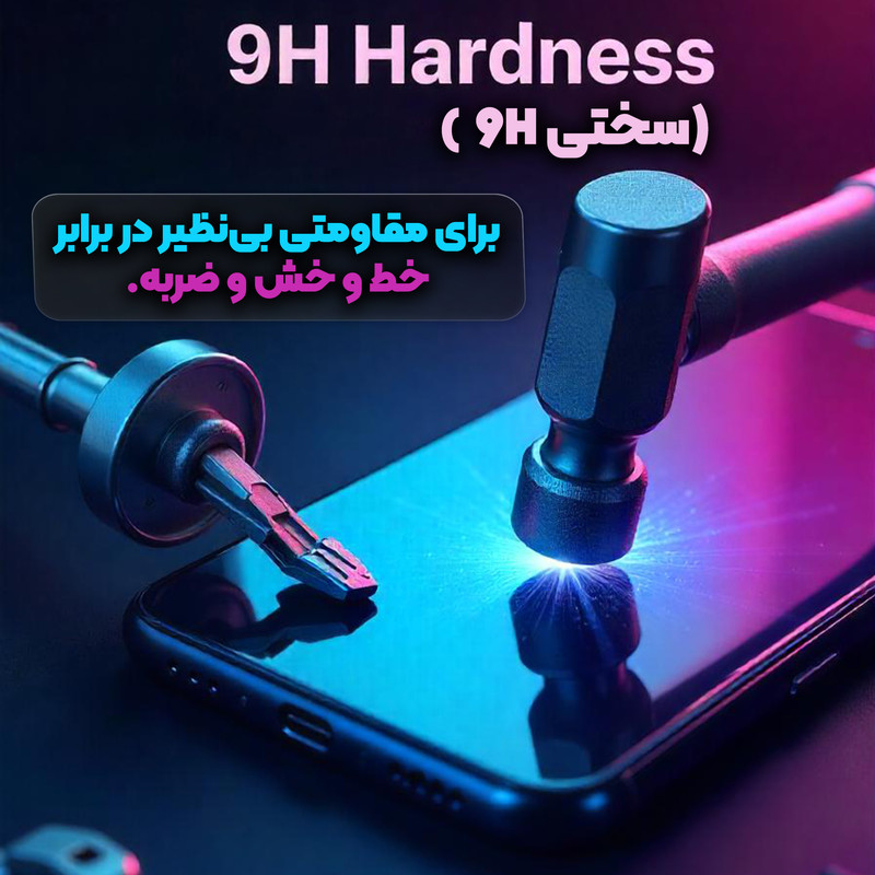 ویژگیها: 9H , قابلیت نصب آسان , مقاوم در برابر چربی و اثرانگشت , مقاوم در برابر خط و خش